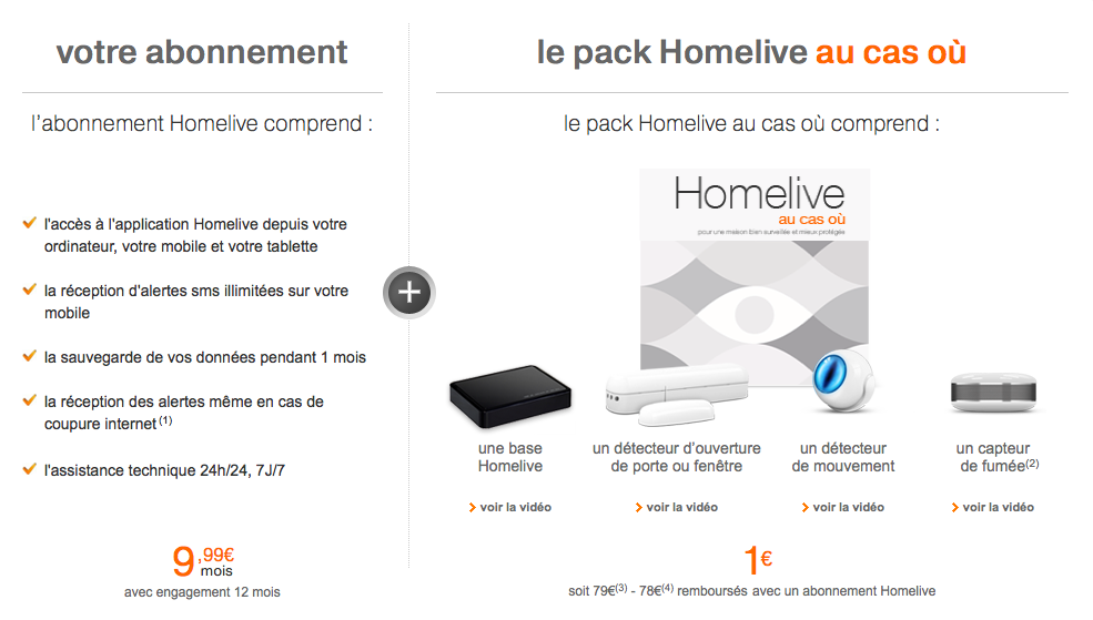 Donc en résumant pour commencer on se retrouve avec un abonnement de 9,99 € par mois sur 12 mois et un kit de départ qui ne nous coûte au final que 1 euros pour des détecteurs de la marque Fibaro.